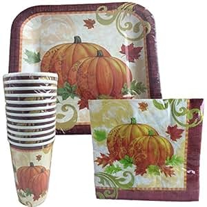 Thanksgiving paper plates and napkins disposable dinnerware set for 24 guests pumpkin theme party supplies happy thanksgiving autumn tableware set in elegant gold foil fall design.